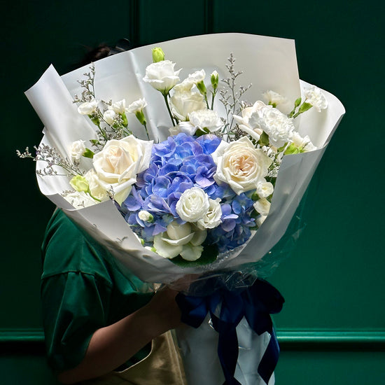 Bó hoa gồm cẩm tú cầu xanh dương và hồng Ohara, điểm xuyết cùng hoa và lá tươi tự nhiên. Sắc xanh dịu mát hòa quyện với sắc hồng tinh tế tạo nên tổng thể thanh lịch, nhẹ nhàng và đầy cảm xúc — món quà hoàn hảo để trao gửi sự trân trọng và yêu thương.