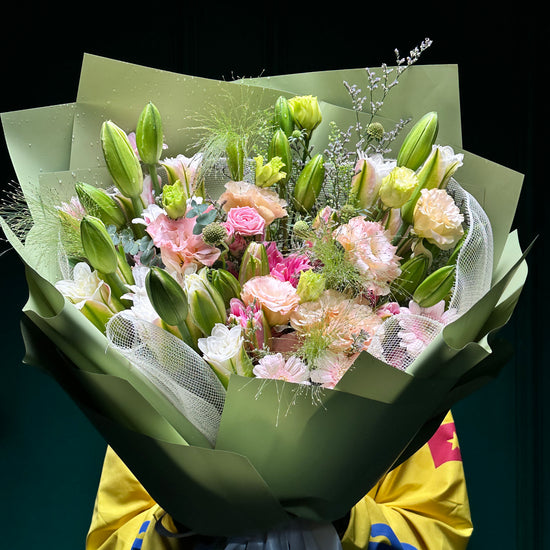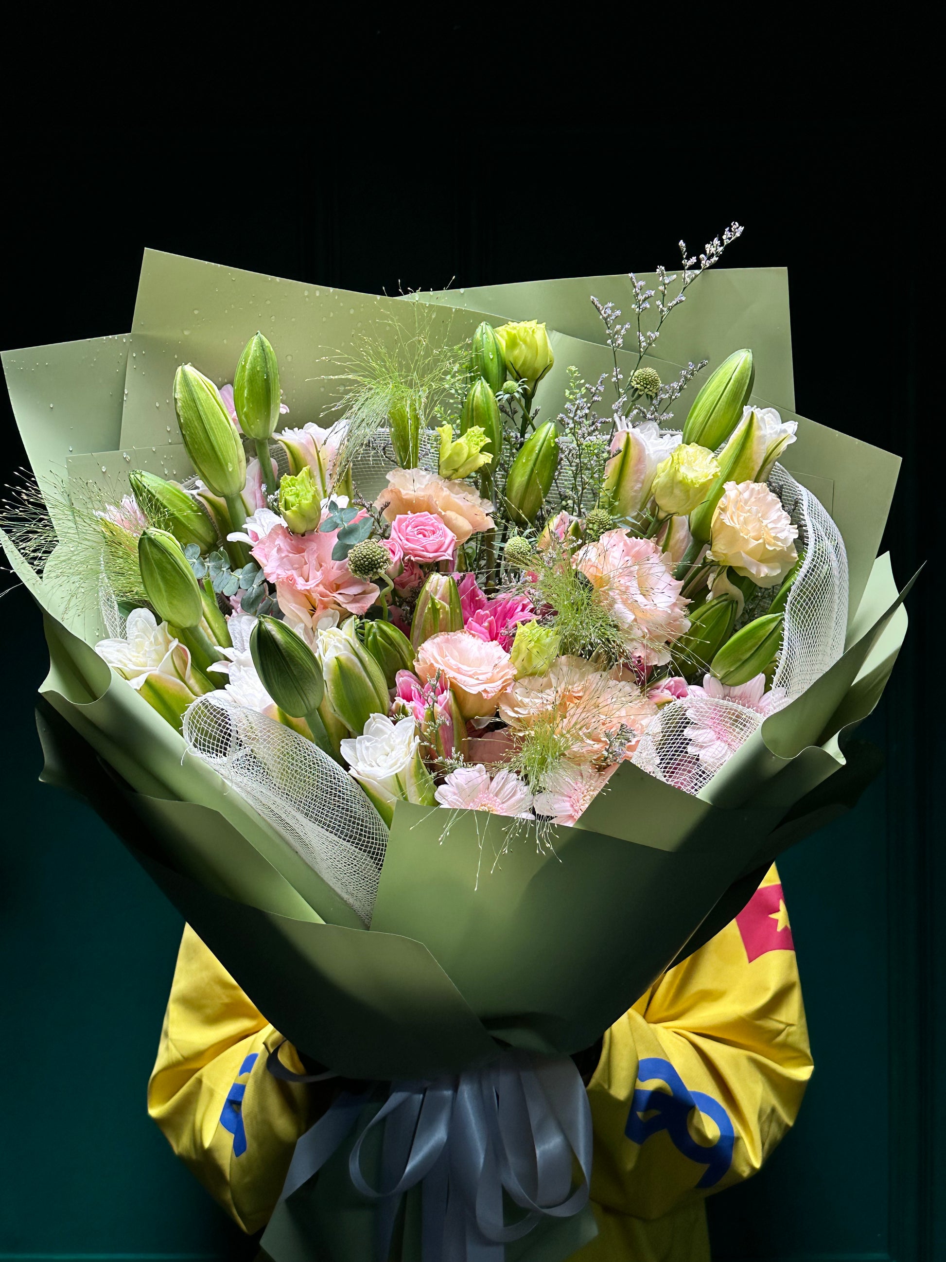Bó hoa gồm ly kép sang trọng và lan tường mềm mại, được điểm xuyết tinh tế bằng hoa và lá tươi tự nhiên. Tông màu hài hòa mang đến cảm giác thanh lịch, trang nhã, phù hợp để tặng trong các dịp đặc biệt hoặc gửi gắm lời chúc nhẹ nhàng, tinh tế.