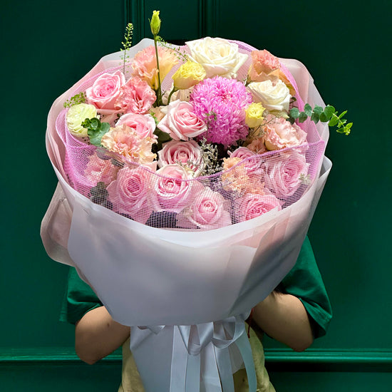 Bó hoa được kết hợp hài hòa giữa hồng O’hara thanh nhã, lan tường nhẹ nhàng và cúc mẫu đơn tươi tắn, điểm xuyết hoa và lá tươi tự nhiên, mang vẻ đẹp ngọt ngào, tinh tế và đầy sức sống.