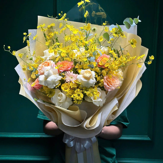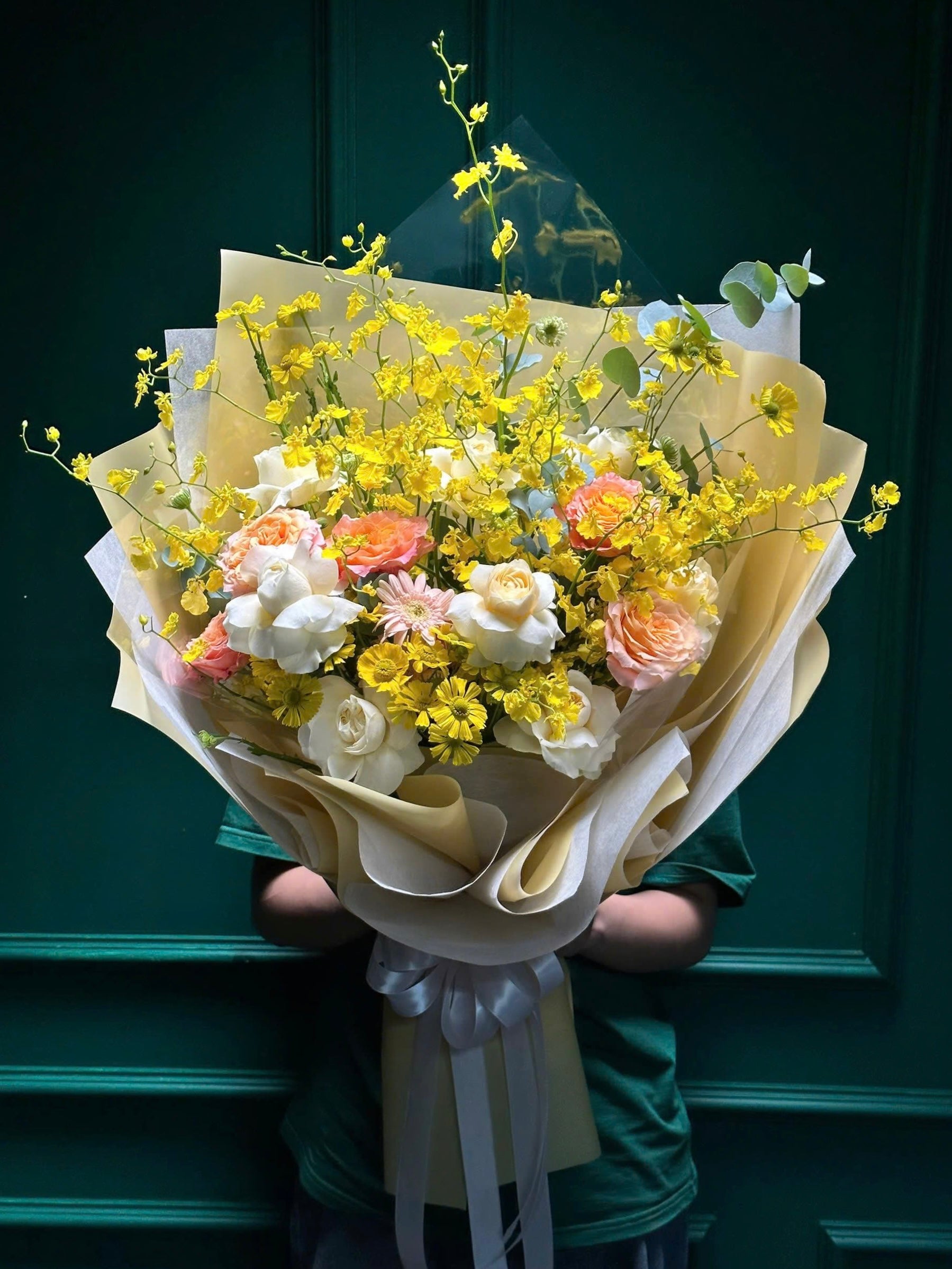 Bó hoa kết hợp lan vũ nữ, hồng O’hara, và đồng tiền nhí — tạo điểm nhấn trẻ trung, rực rỡ. Cùng với hoa và lá tươi tự nhiên được phối tinh tế, bó hoa toát lên vẻ sang trọng nhưng vẫn tươi tắn, gần gũi.