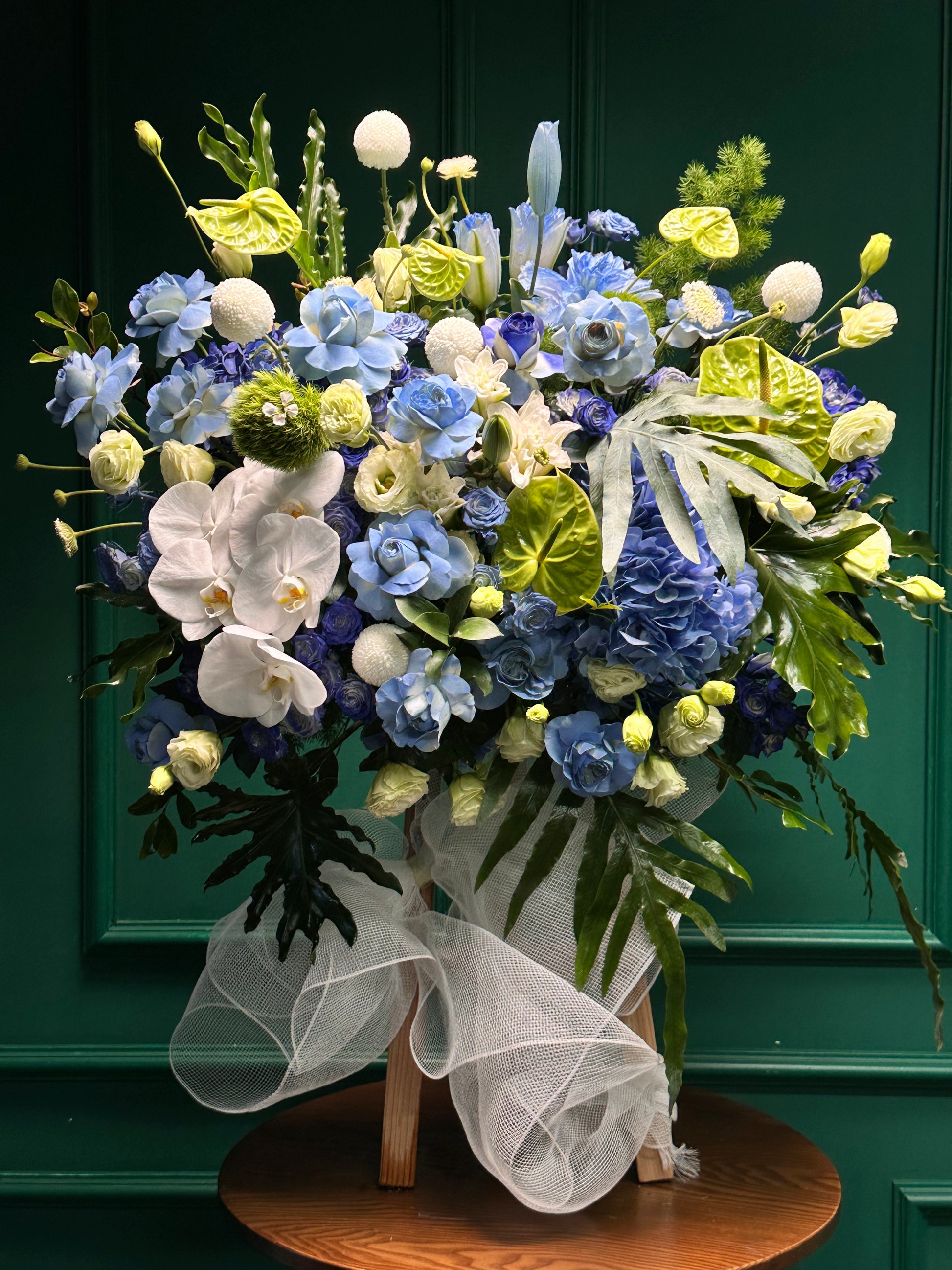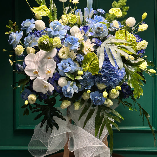 Kệ tranh hoa tông xanh dương gồm lan hồ điệp, hồng môn, cẩm tú cầu, ly kép và hồng Ohara, kết hợp cùng hoa và lá tươi tự nhiên. Sự phối hợp hài hòa giữa các sắc xanh và trắng tạo nên tổng thể thanh lịch, tinh tế và đầy sức sống, thích hợp trang trí hoặc làm quà tặng ý nghĩa.