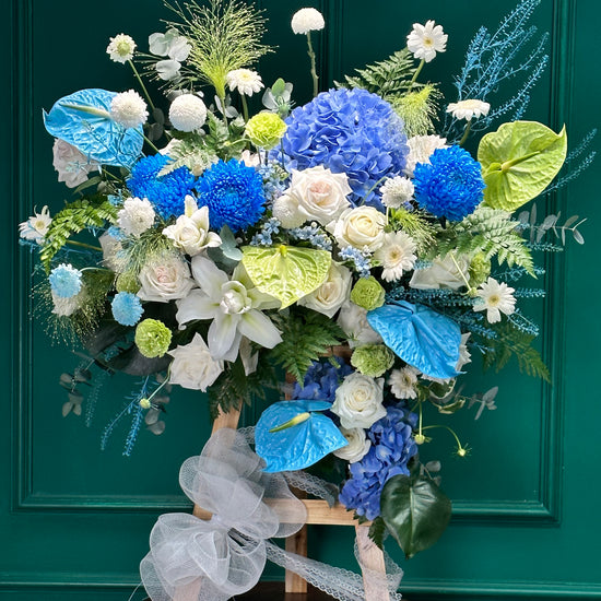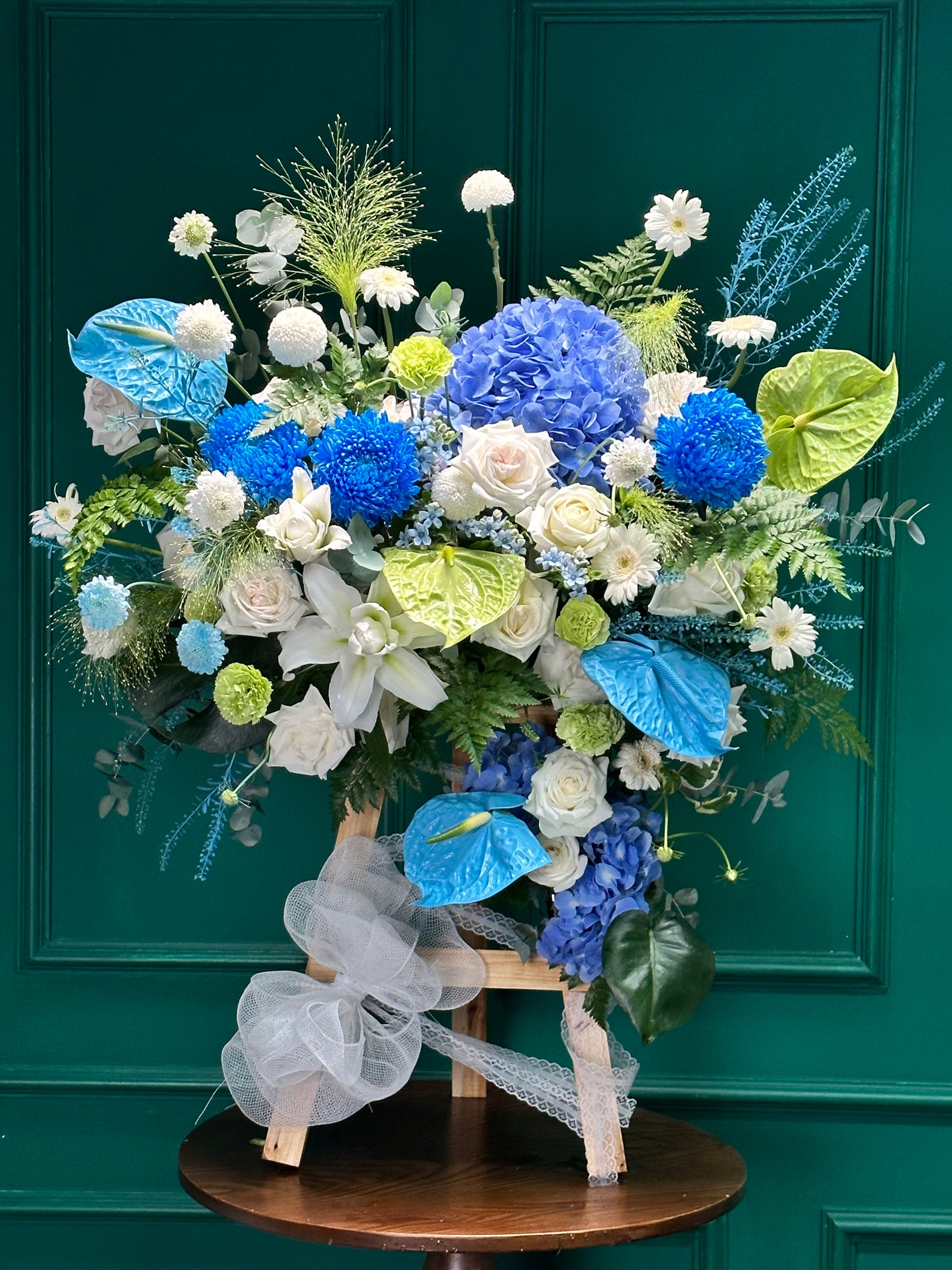 Kệ tranh hoa tông xanh dương gồm hồng môn, cẩm tú cầu, cúc mẫu đơn, hồng Ohara và ly kép, kết hợp cùng hoa và lá tươi tự nhiên. Sự phối hợp tinh tế giữa các sắc hoa tạo nên tổng thể sang trọng, thanh lịch và đầy sức sống, thích hợp trang trí hoặc làm quà tặng ý nghĩa.
