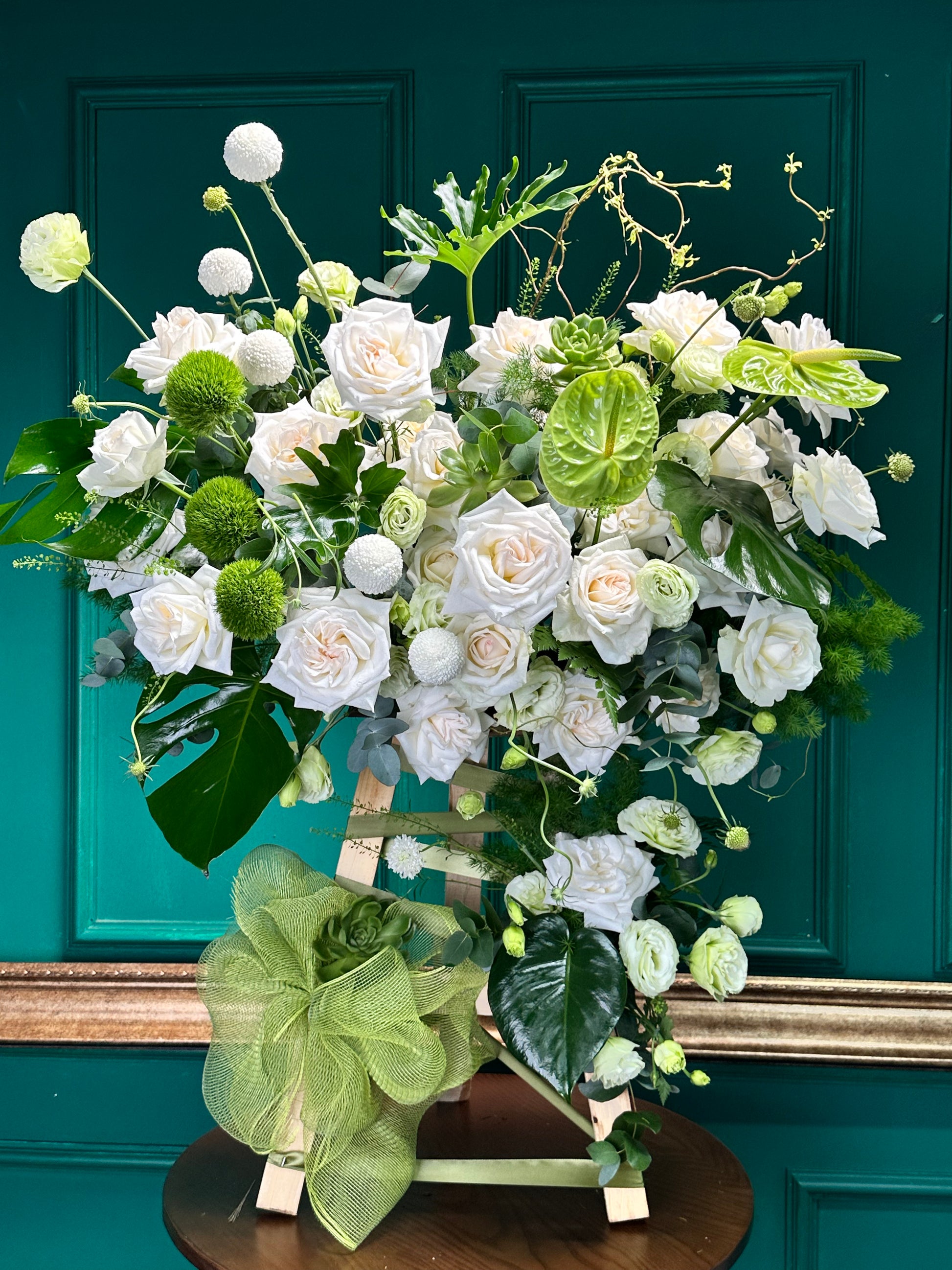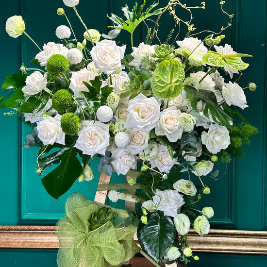 Kệ tranh hoa tông trắng – xanh gồm hồng môn xanh, hồng Ohara, sen đá, cúc Ping Pong và Green Wickey, kết hợp cùng hoa và lá tươi tự nhiên. Sự phối hợp hài hòa giữa các sắc hoa và màu xanh tạo nên tổng thể thanh lịch, tinh tế và tươi mới, thích hợp trang trí hoặc làm quà tặng ý nghĩa.
