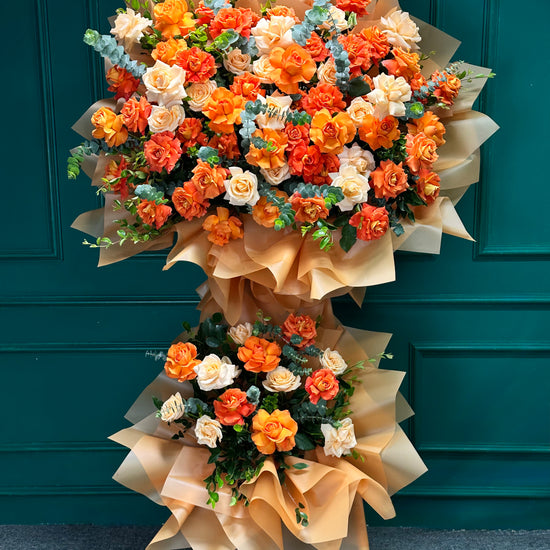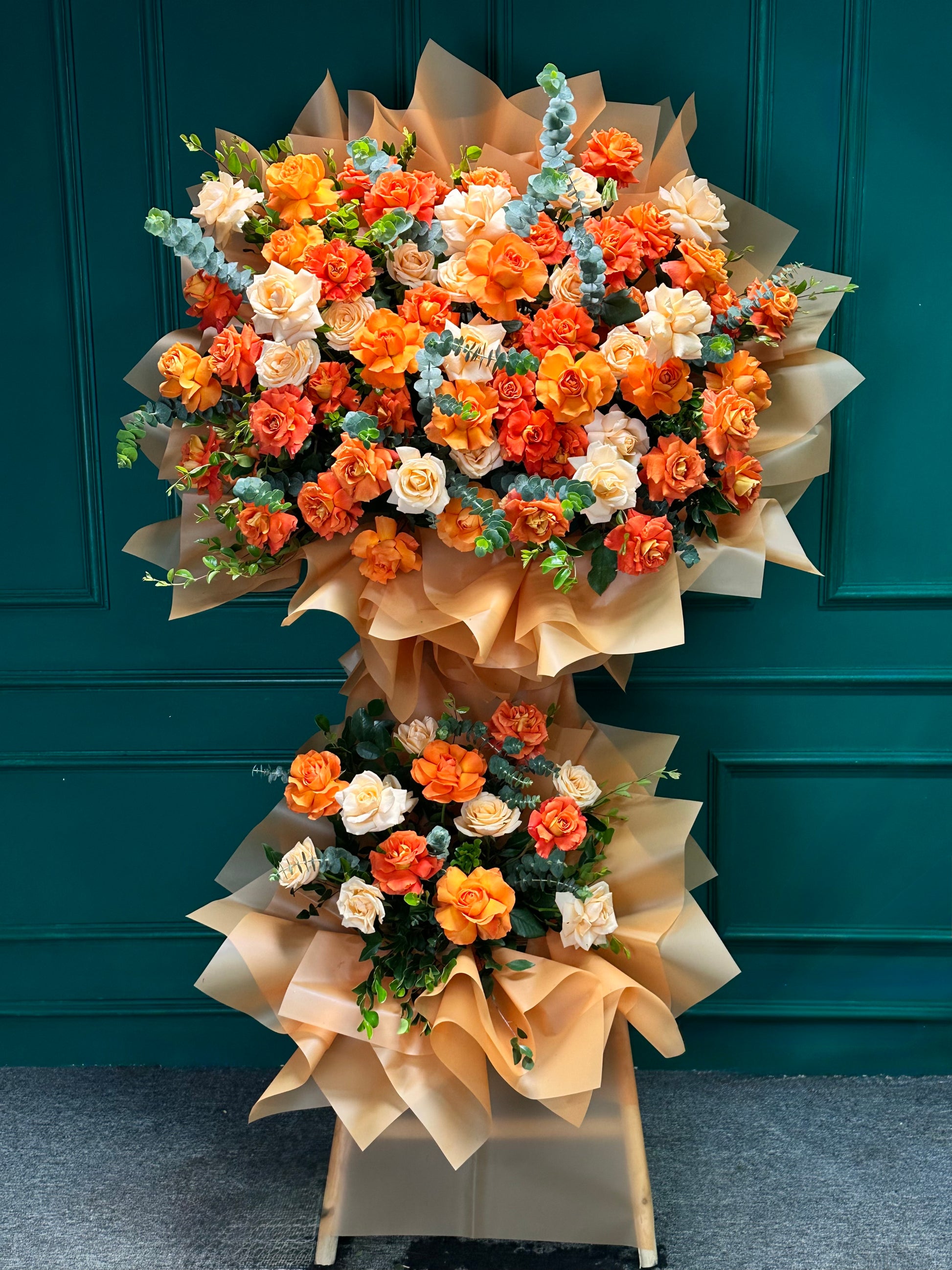 Kệ hoa 2 tầng tông cam gồm hồng Ohara nhiều màu, kết hợp cùng hoa và lá tươi tự nhiên. Sự phối hợp hài hòa giữa các sắc hoa tạo nên tổng thể rực rỡ, sinh động và đầy sức sống, thích hợp trang trí không gian, làm quà tặng ý nghĩa hoặc chúc mừng các sự kiện đặc biệt.