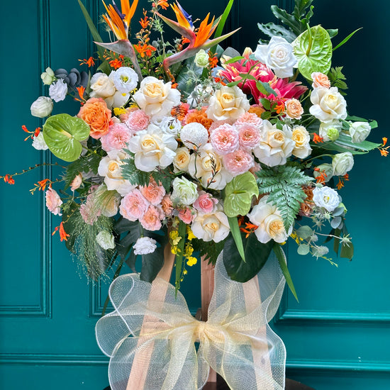 Kệ tranh hoa gồm hồng Ohara, cúc Ping Pong, hồng môn xanh và thiên điểu, kết hợp cùng hoa và lá tươi tự nhiên, phối theo tông cam. Sự kết hợp tinh tế giữa các sắc hoa tạo nên tổng thể rực rỡ, sinh động và đầy sức sống, thích hợp trang trí hoặc làm quà tặng ý nghĩa.