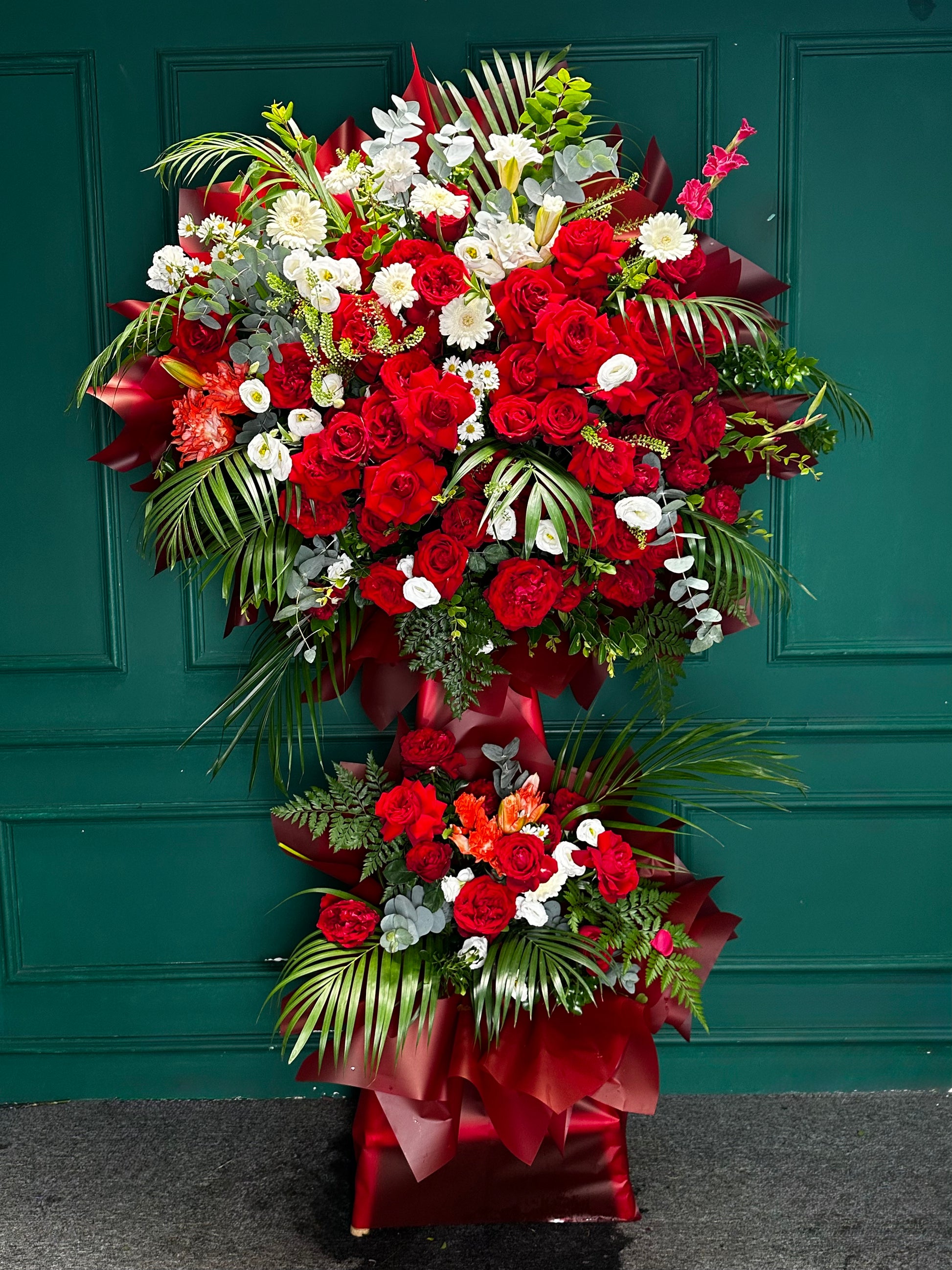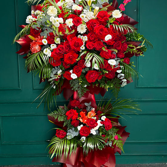 Kệ hoa 2 tầng tông đỏ gồm hồng Ohara đỏ, điểm xuyết đồng tiền trắng, kết hợp cùng hoa và lá tươi tự nhiên. Sự phối hợp tinh tế giữa các sắc hoa tạo nên tổng thể rực rỡ, sang trọng và đầy sức sống, thích hợp trang trí không gian, làm quà tặng ý nghĩa hoặc chúc mừng các sự kiện đặc biệt.