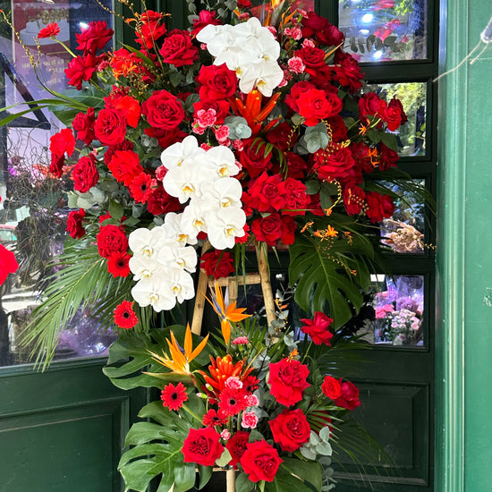 Kệ hoa 2 tầng tông đỏ gồm hồ điệp trắng nổi bật, thiên điểu và hồng Ohara đỏ, kết hợp cùng hoa và lá tươi tự nhiên. Sự phối hợp hài hòa giữa các sắc hoa tạo nên tổng thể rực rỡ, sang trọng và đầy sức sống, thích hợp trang trí không gian, làm quà tặng ý nghĩa hoặc chúc mừng các sự kiện đặc biệt.
