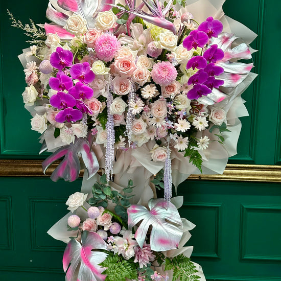 Kệ hoa 2 tầng tông trắng – hồng gồm hồ điệp tím, thiên điểu sơn hồng phá cách, hồng Ohara và cúc mẫu đơn, kết hợp cùng hoa và lá tươi tự nhiên. Sự phối hợp sáng tạo giữa các sắc hoa tạo nên tổng thể thanh lịch, sang trọng và đầy sức sống, thích hợp trang trí không gian, làm quà tặng ý nghĩa hoặc chúc mừng các sự kiện đặc biệt.