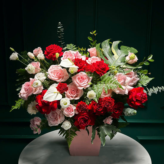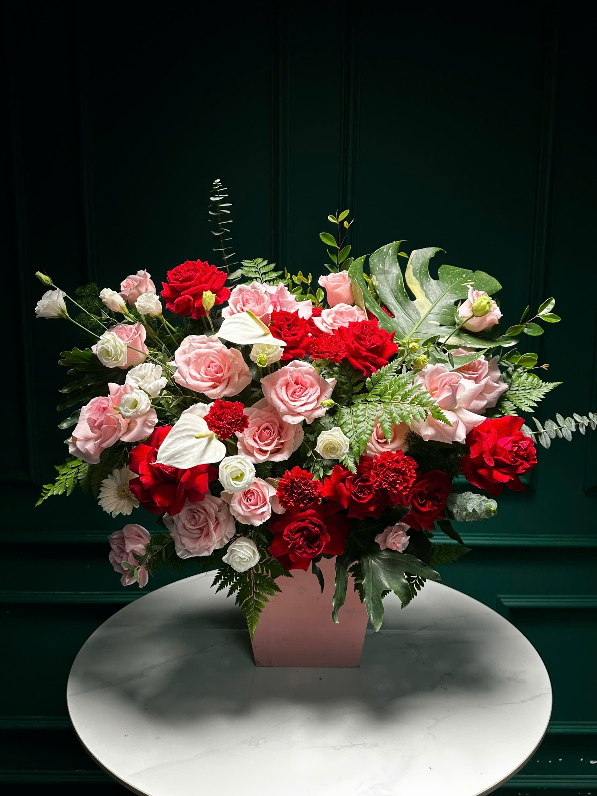 Sắc hồng Ohara đỏ và hồng hòa quyện cùng phăng, lan tường, và điểm nhấn hồng môn trắng tạo nên tổng thể vừa sang trọng vừa tươi trẻ.