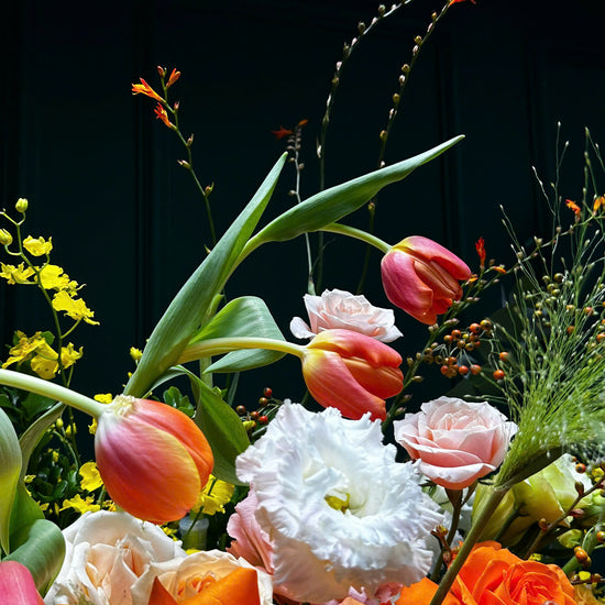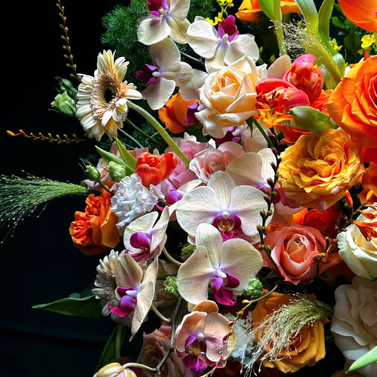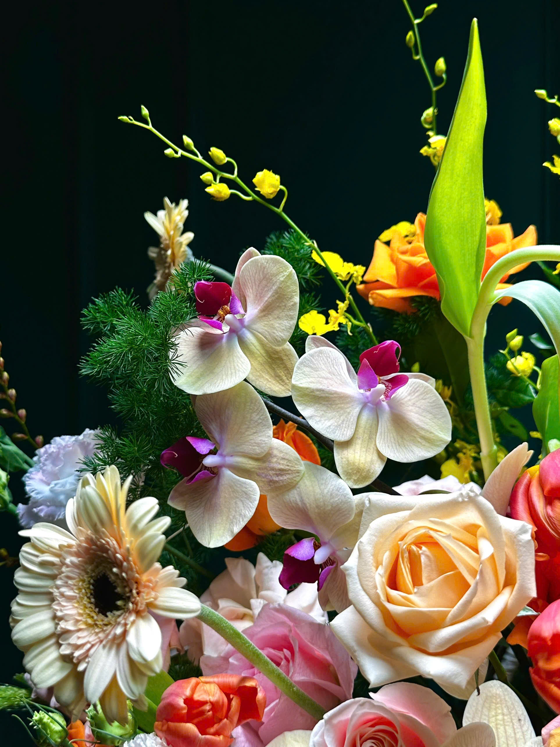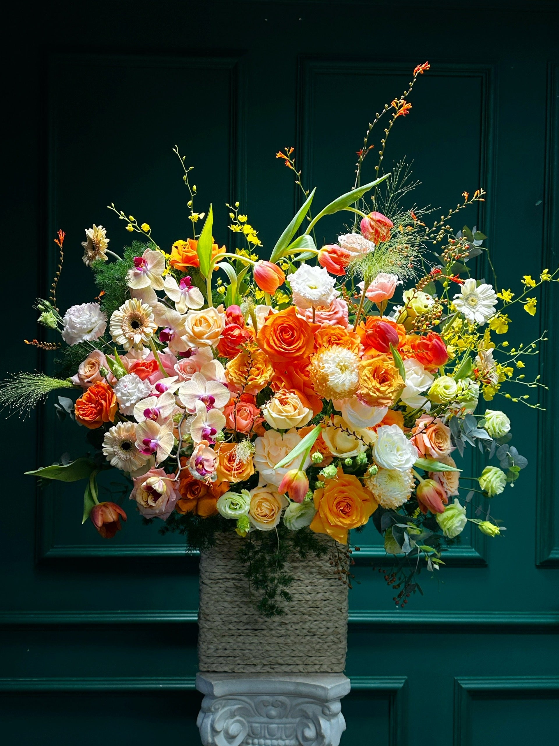 Lẵng hoa tông cam rạng rỡ mà thanh nhã. Sắc lan hồ điệp mềm mại kết hợp cùng tulip, hồng Ohara, phăng và đồng tiền tạo nên bản hòa sắc tươi sáng, tràn đầy năng lượng tích cực. Những cành điểm và mảng xanh tự nhiên được sắp khéo léo làm nền, giúp tôn lên nét ấm áp và sang trọng của từng bông hoa.