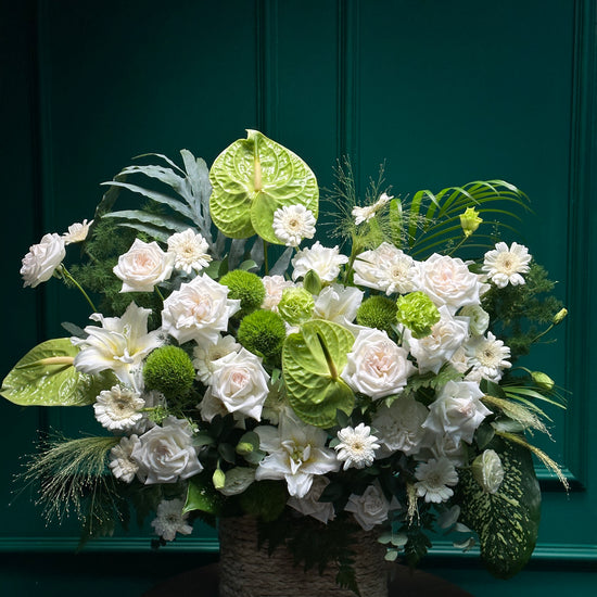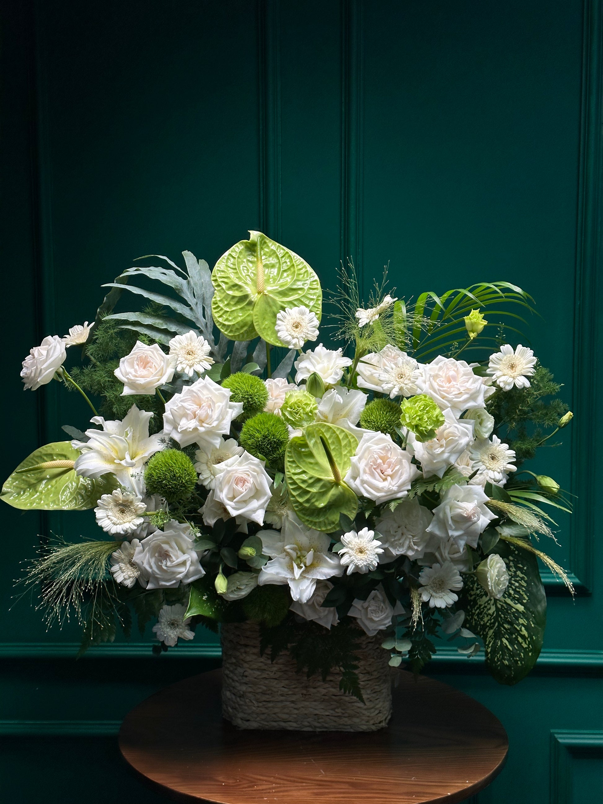 Lẵng hoa gồm ly kép trắng, hồng môn, hồng Ohara và Green Wickey, kết hợp cùng hoa và lá tươi tự nhiên, phối theo tông xanh – trắng. Sự hòa quyện giữa sắc trắng thanh khiết và xanh mát tạo nên tổng thể sang trọng, tinh tế và thanh thoát, thích hợp làm quà tặng cho những dịp đặc biệt hoặc gửi gắm lời chúc bình an và may mắn.
