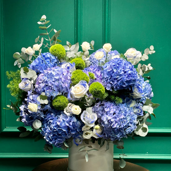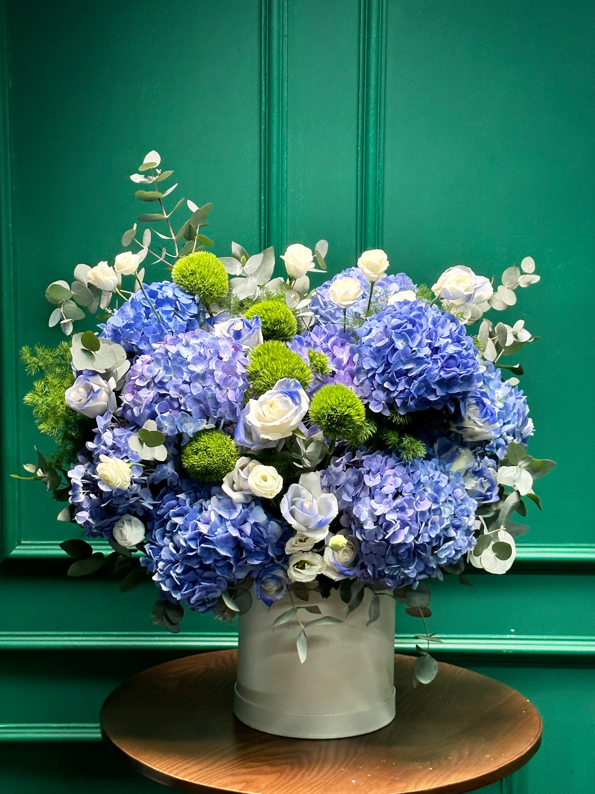 Lẵng hoa lấy cẩm tú cầu xanh làm chủ đạo, kết hợp cùng hồng Ohara và hoa, lá tươi tự nhiên, phối theo tông xanh dương. Sự hòa quyện giữa sắc xanh dịu mát và hồng nhẹ nhàng tạo nên tổng thể tinh tế, thanh lịch và đầy sức sống, là lựa chọn hoàn hảo để làm quà tặng hoặc gửi gắm lời chúc bình an và may mắn.