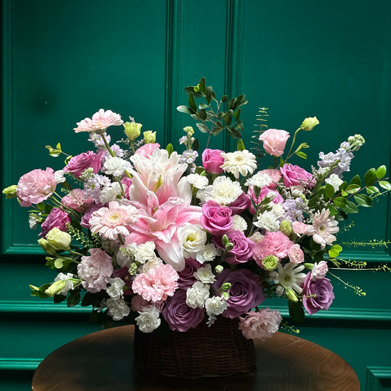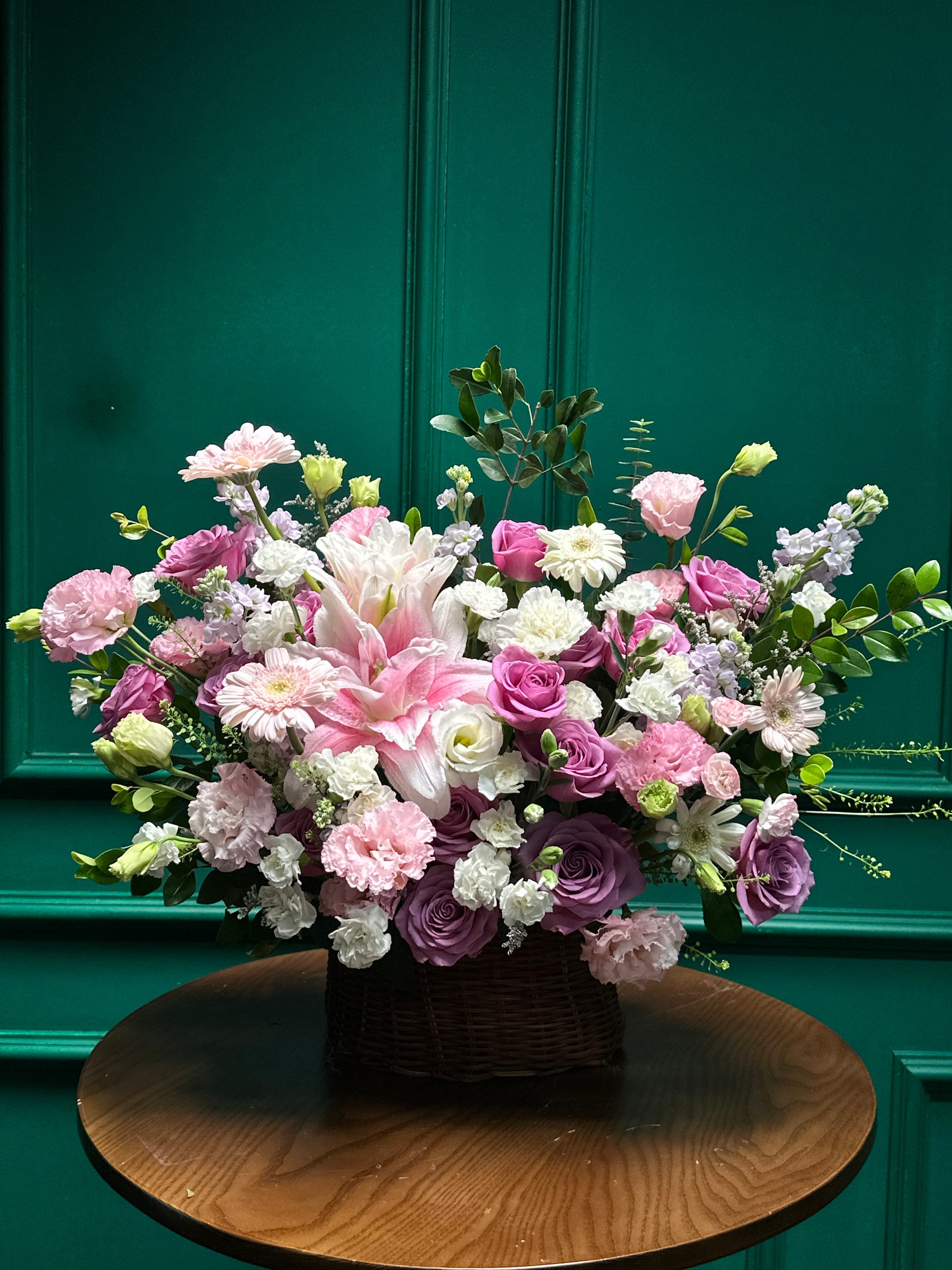 Lẵng hoa gồm ly kép, hồng Ohara và đồng tiền nhí, kết hợp cùng hoa và lá tươi tự nhiên. Sự phối hợp tinh tế giữa các sắc hoa tạo nên tổng thể sang trọng, thanh lịch và đầy sức sống, thích hợp làm quà tặng hoặc gửi gắm lời chúc ấm áp và ý nghĩa.