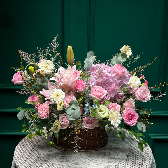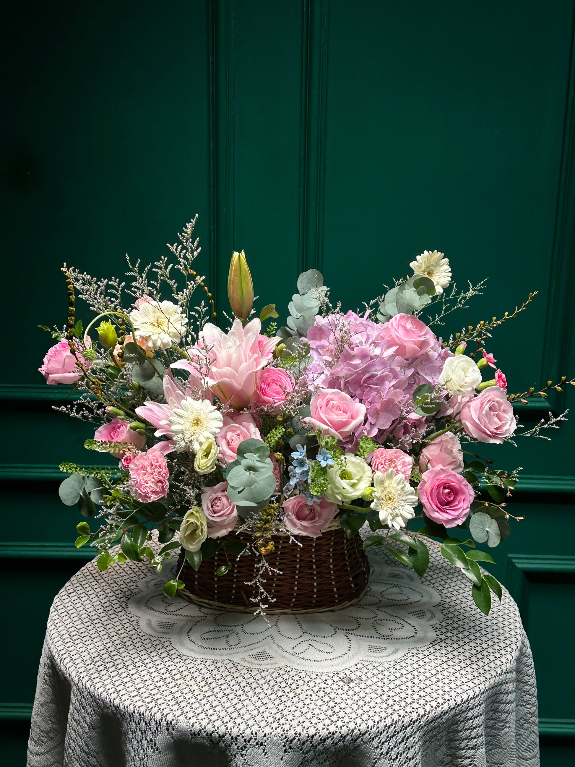Lẵng hoa gồm ly kép, hồng Ohara và cẩm tú cầu, kết hợp cùng hoa và lá tươi tự nhiên. Sự phối hợp hài hòa giữa các sắc hoa tạo nên tổng thể sang trọng, tinh tế và đầy sức sống, thích hợp làm quà tặng hoặc gửi gắm lời chúc ấm áp và ý nghĩa.