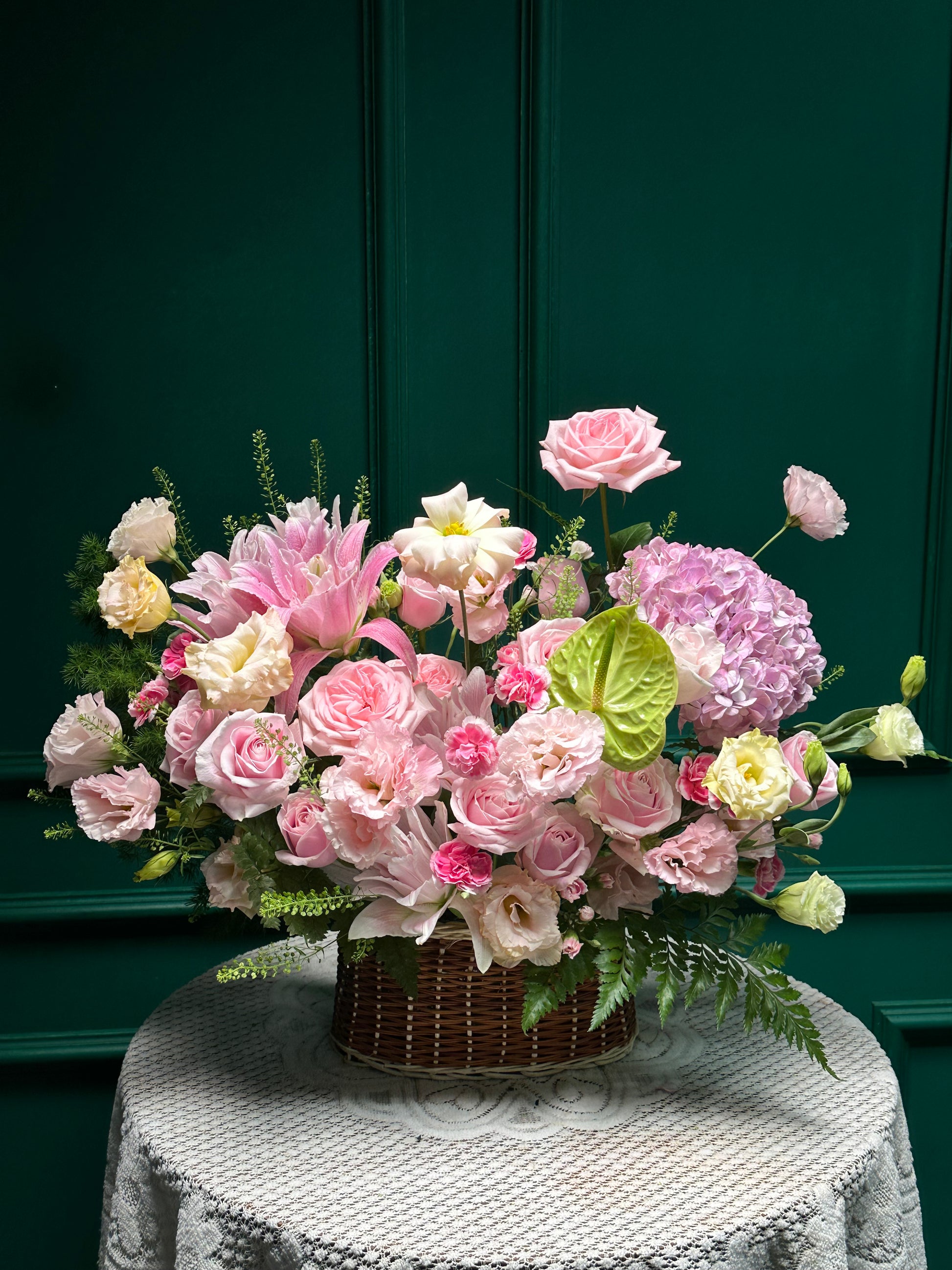 Lẵng hoa gồm hồng môn, ly kép, hồng Ohara và cẩm tú cầu, kết hợp cùng hoa và lá tươi tự nhiên. Sự phối hợp hài hòa giữa các sắc hoa tạo nên tổng thể sang trọng, tinh tế và đầy sức sống, thích hợp làm quà tặng hoặc gửi gắm lời chúc ấm áp và ý nghĩa.