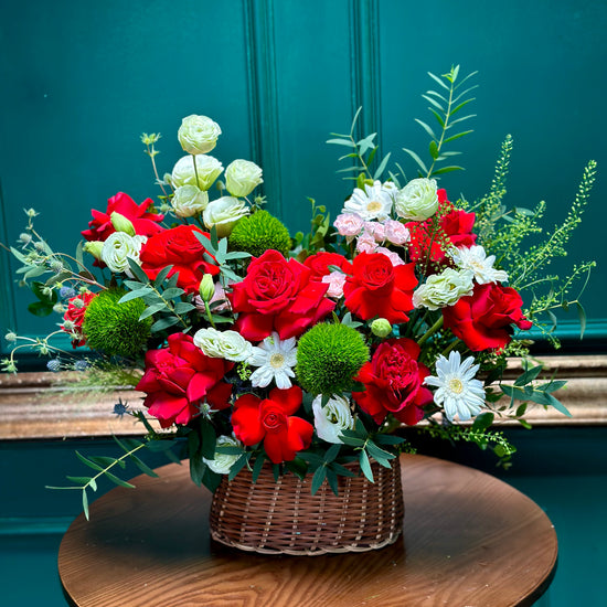 Lẵng hoa gồm Green Wickey và hồng Ohara đỏ, kết hợp cùng hoa và lá tươi tự nhiên. Sắc đỏ nổi bật hòa cùng tông xanh tươi mát tạo nên tổng thể sang trọng, mạnh mẽ mà vẫn đầy tinh tế — biểu tượng cho tình yêu, nhiệt huyết và may mắn.
