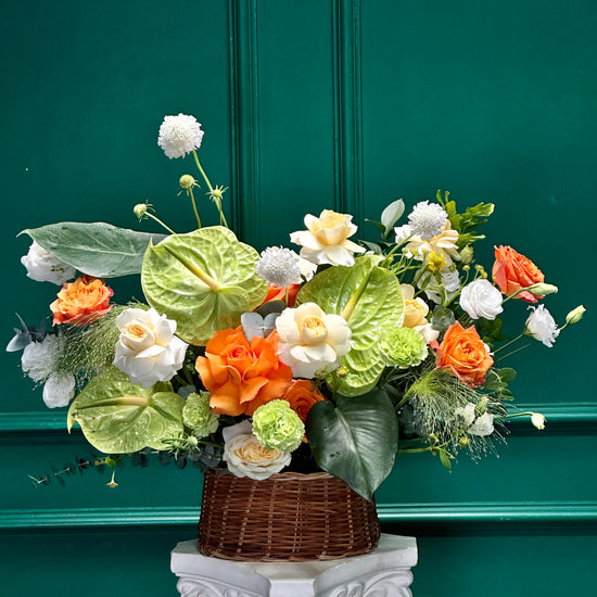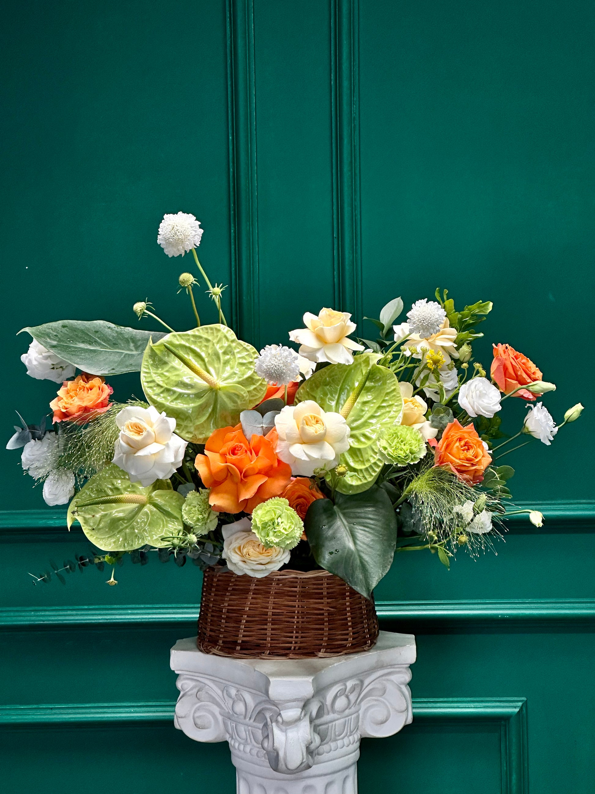 Lẵng hoa gồm hồng môn xanh và hồng Ohara, kết hợp cùng hoa và lá tươi tự nhiên. Sự phối hợp tinh tế giữa sắc xanh mát và hồng dịu nhẹ tạo nên tổng thể sang trọng, thanh lịch và tươi mới, phù hợp làm quà tặng hoặc gửi gắm lời chúc ấm áp và ý nghĩa.