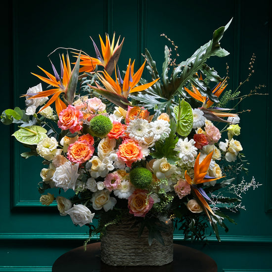 Lẵng hoa gồm thiên điểu, Green Wickey, đồng tiền nhí, hồng Ohara, và hồng môn, kết hợp cùng hoa và lá tươi tự nhiên. Sự kết hợp tinh tế giữa các sắc hoa và màu xanh tạo nên tổng thể sang trọng, tươi mới và đầy sức sống, thích hợp làm quà tặng hoặc gửi gắm lời chúc may mắn, hạnh phúc và thành công.